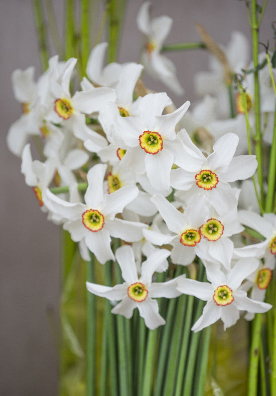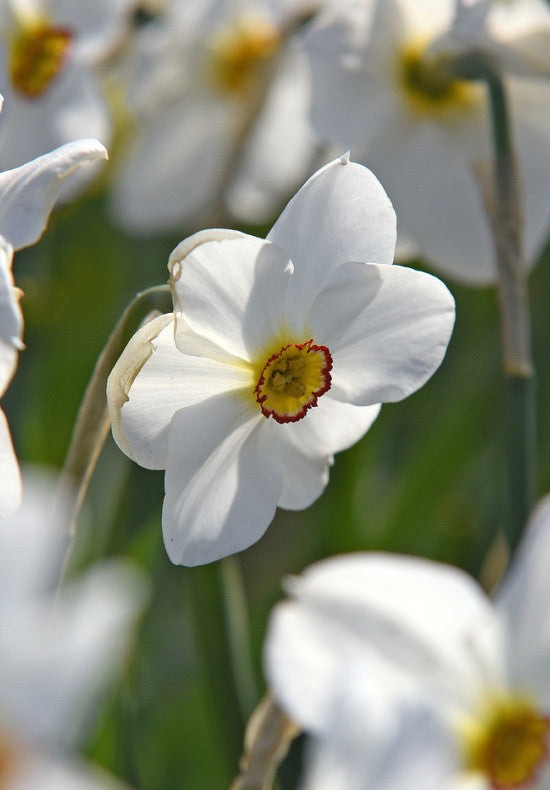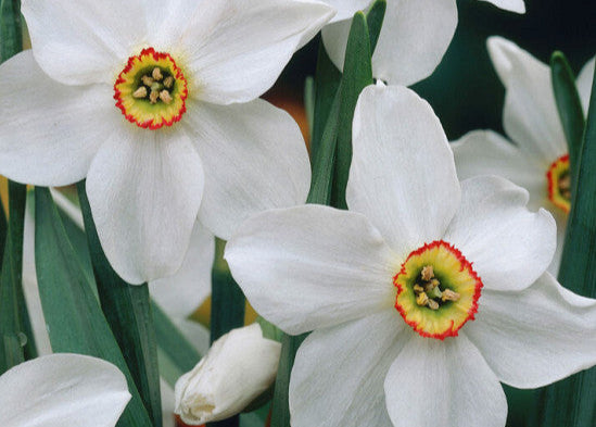 • Bloom: White petals with a small yellow cup edged in red, fragrant and classic