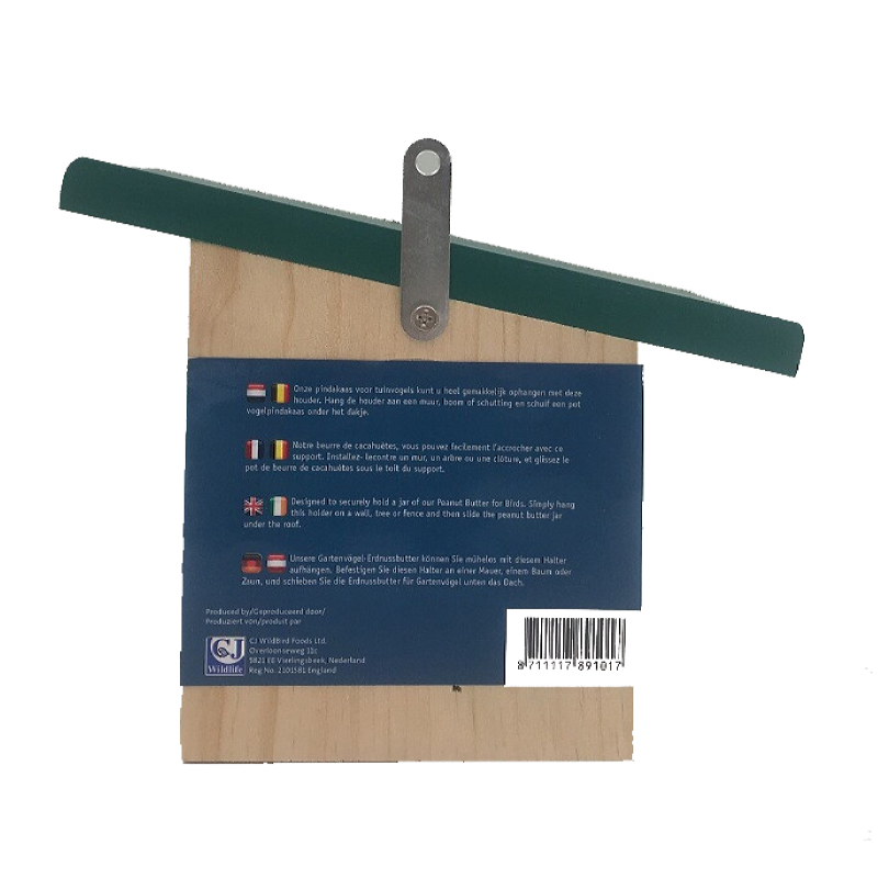 • Design: Simple wooden feeder specially designed to hold peanut butter jars, providing birds with a high-energy food source