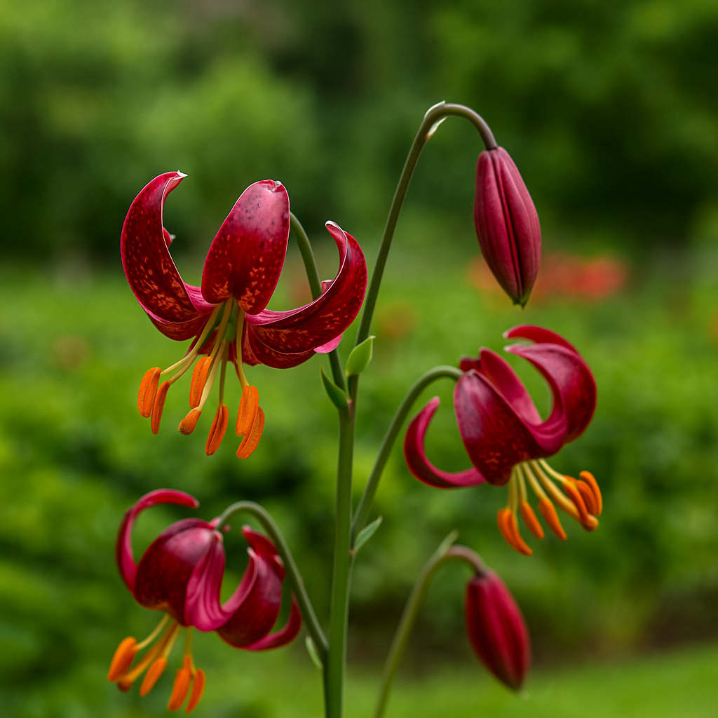• Deep mahogany-red blooms with golden-orange throats and speckled petals